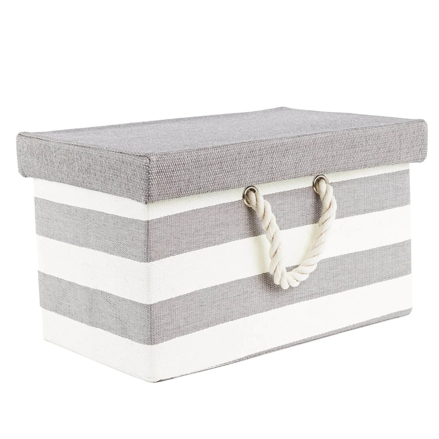 This fabric storage has a grey and white strip design to keep your room tidy,The lid acts as a shield and two cotton handles are easy for us to move it.